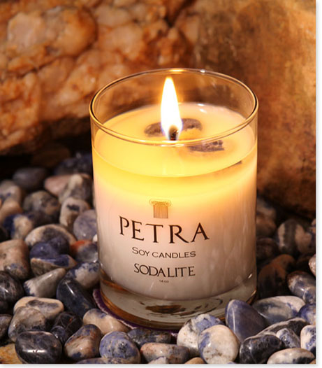 SodaliteSelf Love & Rational ThoughtsA serene, tropical aroma that infuses the senses with feelings of self-esteem and trust. By burning this candle along with the Sodalite gemstones, a calming yet energetic essence will be released into the environment. This will promote self-confidence and rational thoughts.$45.00 Includes 2 genuine Sodalite gemstones and a natural Agate that can be used as a snuffer/coaster.